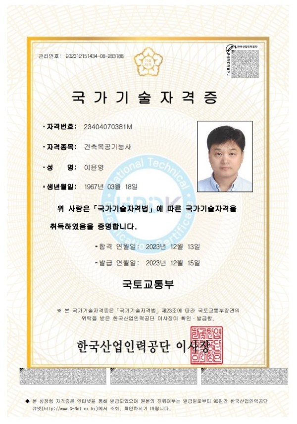 건축목공기능사 자격증 페이지 정보 작성자 다온라인 댓글 댓글 0건 조회Hit 28회 작성일Date 26-01-18 14:46 본문 건축목공기능사 자격증 목록 글쓰기 이전글건설업등록증 26.01.18 다음글전기실무교육 / 심화교육 수료증 26.01.18 댓글 0 댓글목록 등록된 댓글이 없습니다.