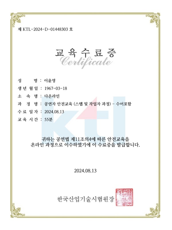 공연자 안전교육 수료증 페이지 정보 작성자 다온라인 댓글 댓글 0건 조회Hit 28회 작성일Date 26-01-19 14:26 본문 공연무대, 졸업작품 전시장을 제작하기 위한 안전교육수료장 입니다. 목록 글쓰기 다음글인테리어공사 표준계약서 26.01.18 댓글 0 댓글목록 등록된 댓글이 없습니다.